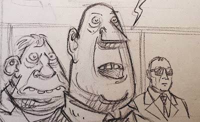 L'encrage, lui, n'interviendra qu'à partir d'octobre pour... un certain temps! Je peux déjà vous dire qu'il y aura de l'évolution dans le dessin, à commencer par Raoul lui-même qui aura le plaisir de ne plus avoir seulement deux poses de bouche, une fermée et une ouverte, mais plusieurs sortes de bouche fermée, et plusieurs sortes d'ouverte, comme n'importe quel être humain!